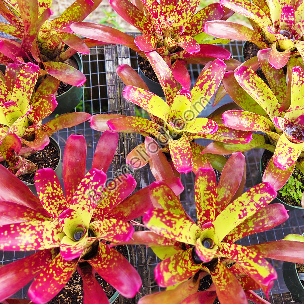 Neoregelia 'Spanish Sunset' is a striking plant hybrid created by Shane Zaghini of Australia. Its semi-serrated leaves feature bold mottling, with bright red coloring on both sides and heavier mottling on the upper side of the leaves. The leaves are heavily spotted with lime green and yellow blotches, creating a stunning contrast. As the plant matures, its symmetrical rosette can reach up to 20 inches across, making it a truly impressive addition to any collection. 'Spanish Sunset' is a must-have for anyone looking for a bromeliad that combines bold coloration with unique and eye-catching mottling.